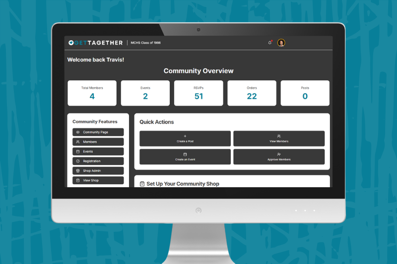Create events, collect RSVPs, allow members to register and pay for tickets, sell custom-branded merchandise, and send email or text updates without switching tools or chasing people down.
