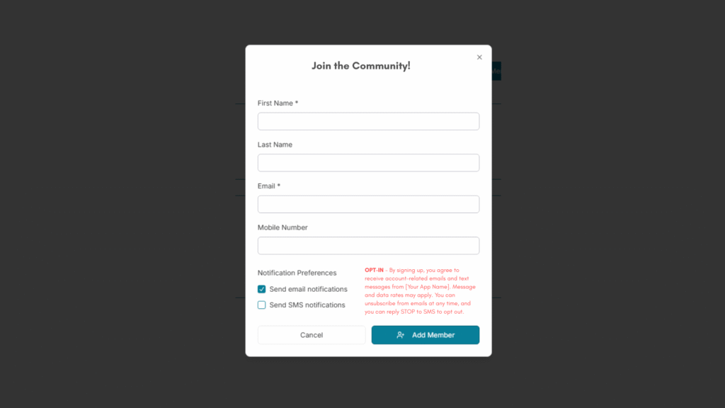 The Opt-In message below appears on the ‘Join Community” page users land on when they are invited to join the community. The app is still in development so no production URL’s exist yet.